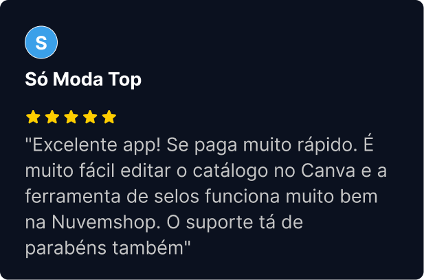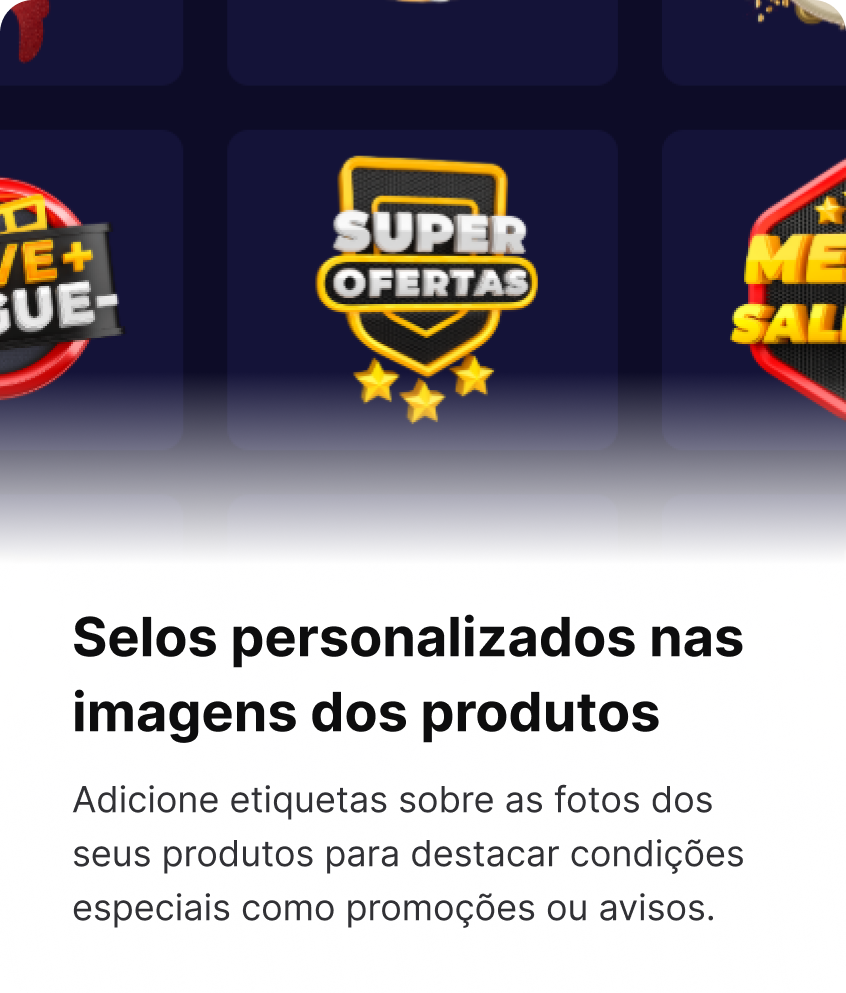 Você consegue adicionar selos especiais como selos de entrega rápida, de produto disponível, de descontos, de últimas peças, e de promoções, por exemplo, em qualquer produto.